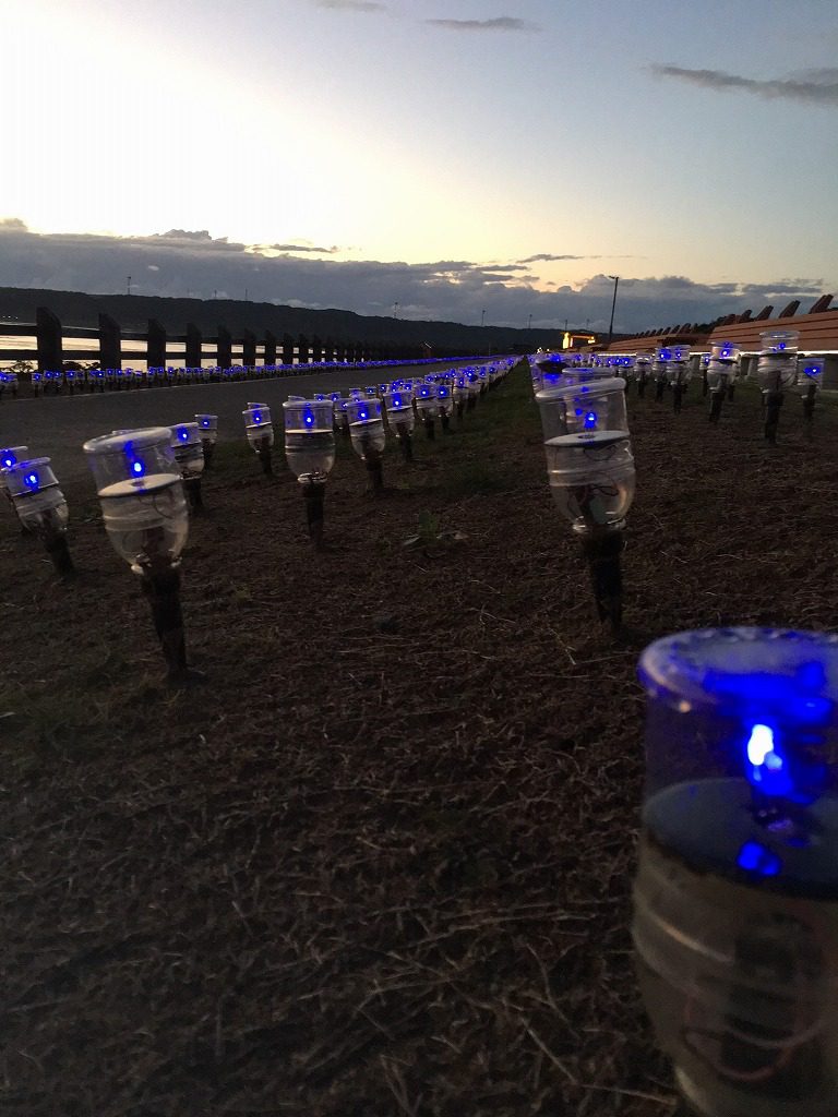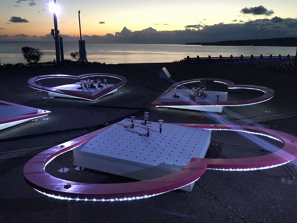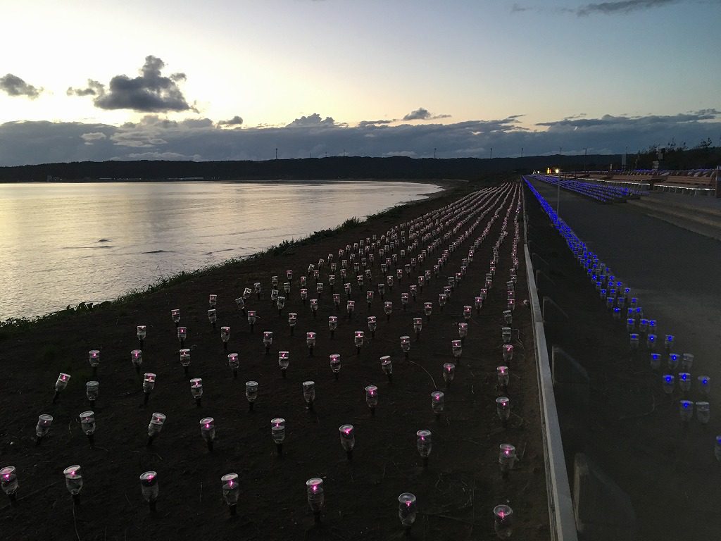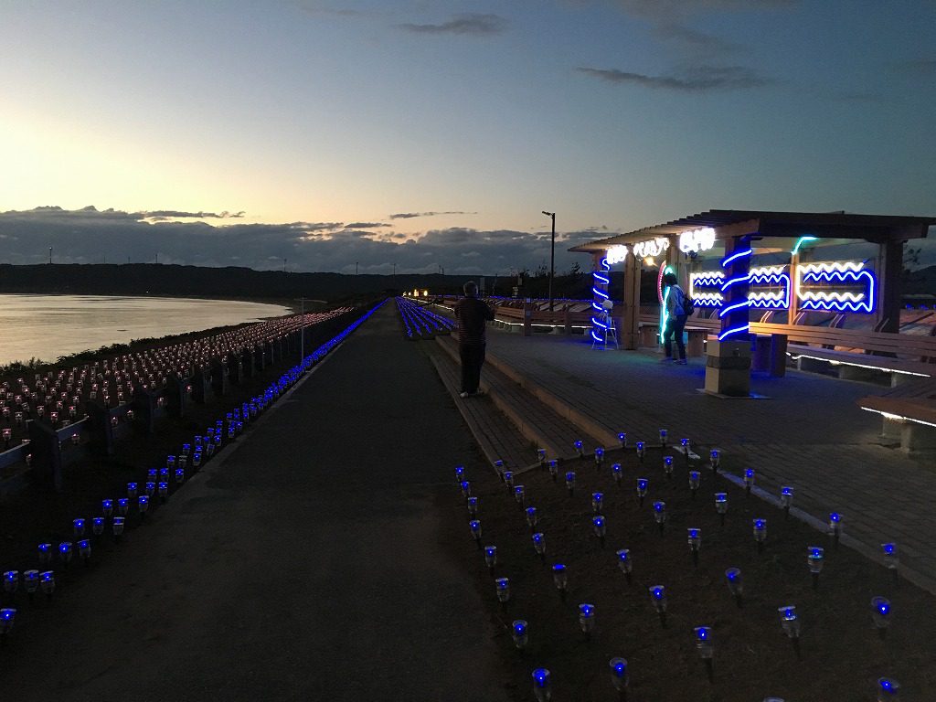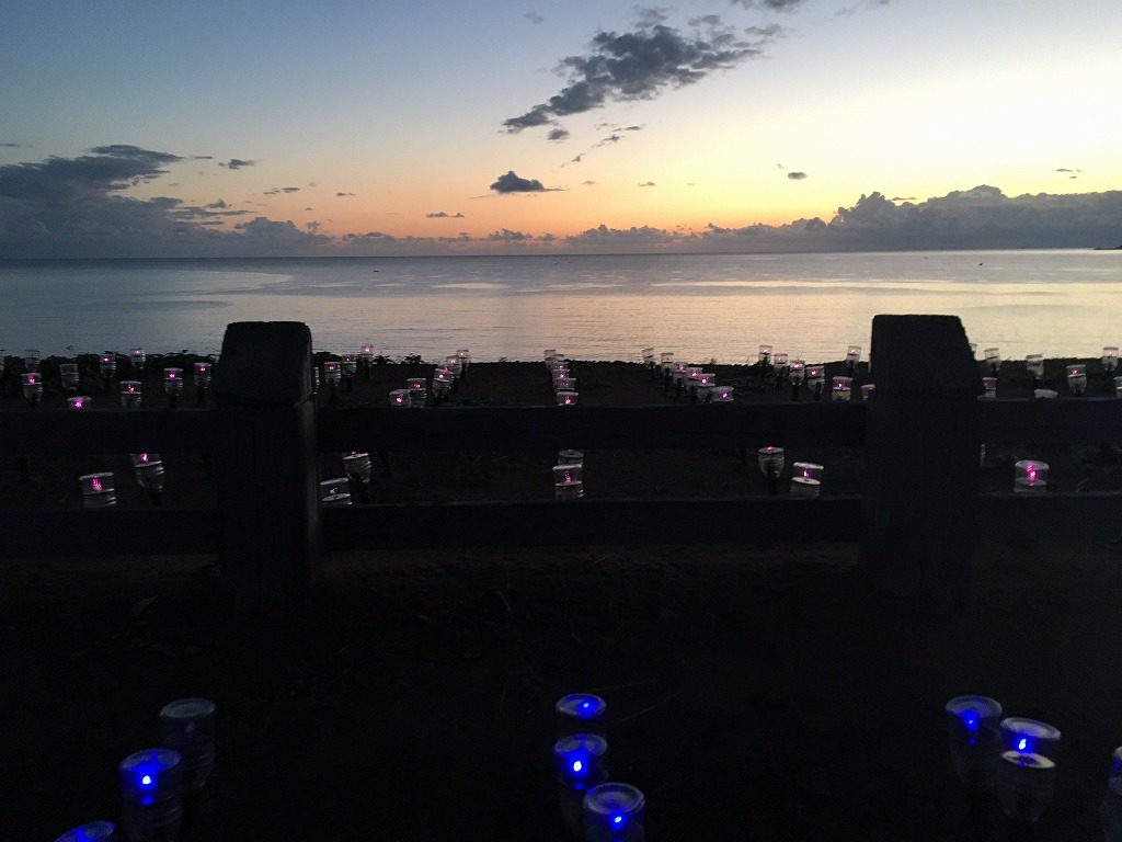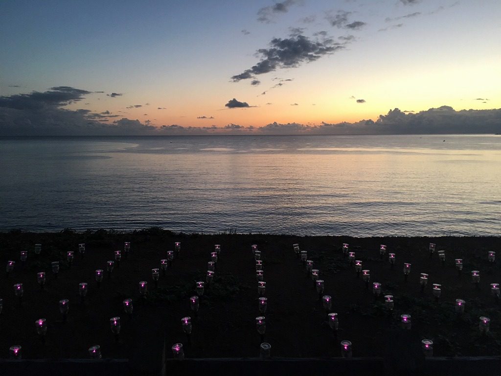 夕暮れとなり、ペット蛍のおしりが光ってきました。夕焼けとのコラボがなんとも美しいです。さくら貝のピンクと海のブルー・・