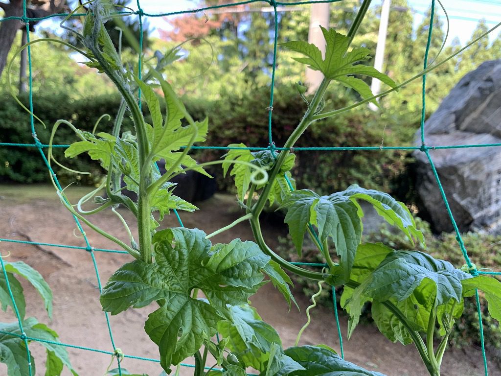 日陰の時間が長いゴーヤは茎が細くて色も薄いです・・