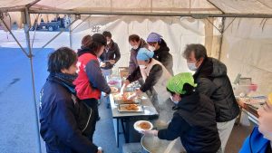 2月3日、会社の目の前にある避難所での炊き出しの時、ちょうどその避難所でお世話をされていた神奈川県のボランティアのお二人にも、是非!!とカレーライスを召し上がっていただきました。そして、その1週間後の朝、今日神奈川県に戻ります!とカレーライスのお礼を伝えにわざわざご挨拶に来てくれました。こちらこそ、心から感謝しています。
