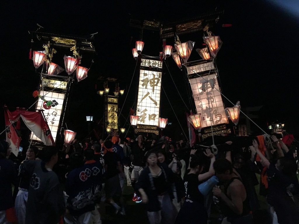 8月25日・26日の冨木八朔祭礼です。約800年前に始まったと伝えられていますが、もともとは八幡・里本江と領家の祭りに地頭町が加わり、近郷の各地区の太鼓と旗と御明しが参加し、文久4年(1864年)に東小室が神輿を出してから各神社の神輿も参加するようになり現在のような賑やかな祭りになったようです。25日のお旅祭りでは、約30基のキリコが八幡神社まで男神様を乗せた神輿を迎えに行きます。そして、いよいよ妻である住吉神社の女神様の元に到着です。