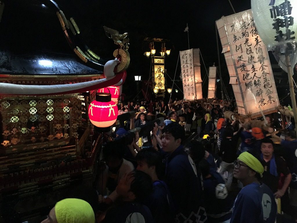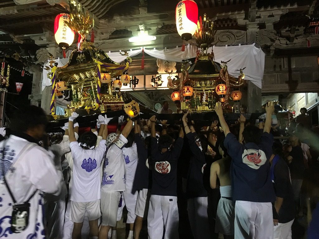 そして翌日の本祭りです。住吉神社での神事の後、八幡神社の神輿を先頭に各神社の神輿11基が昼2時半頃お立ちして、増穂が浦に集まり浜廻りをしてから、キリコと供に八幡神社まで練り歩きます。そして夜、各神社の神輿が次々と八幡神社に到着しました。