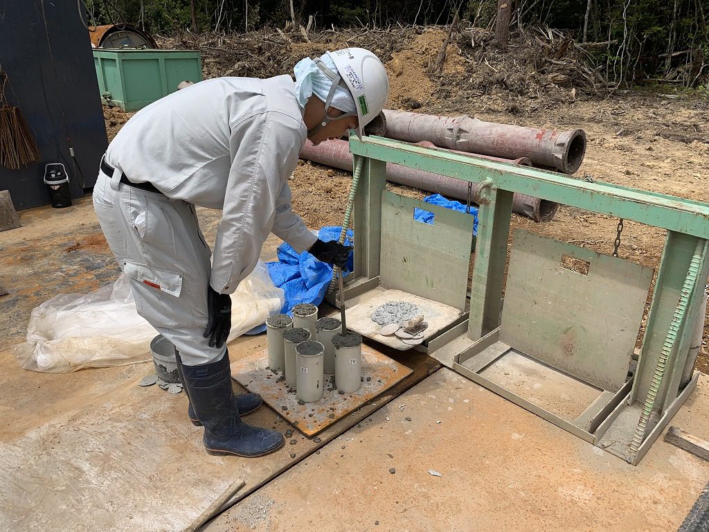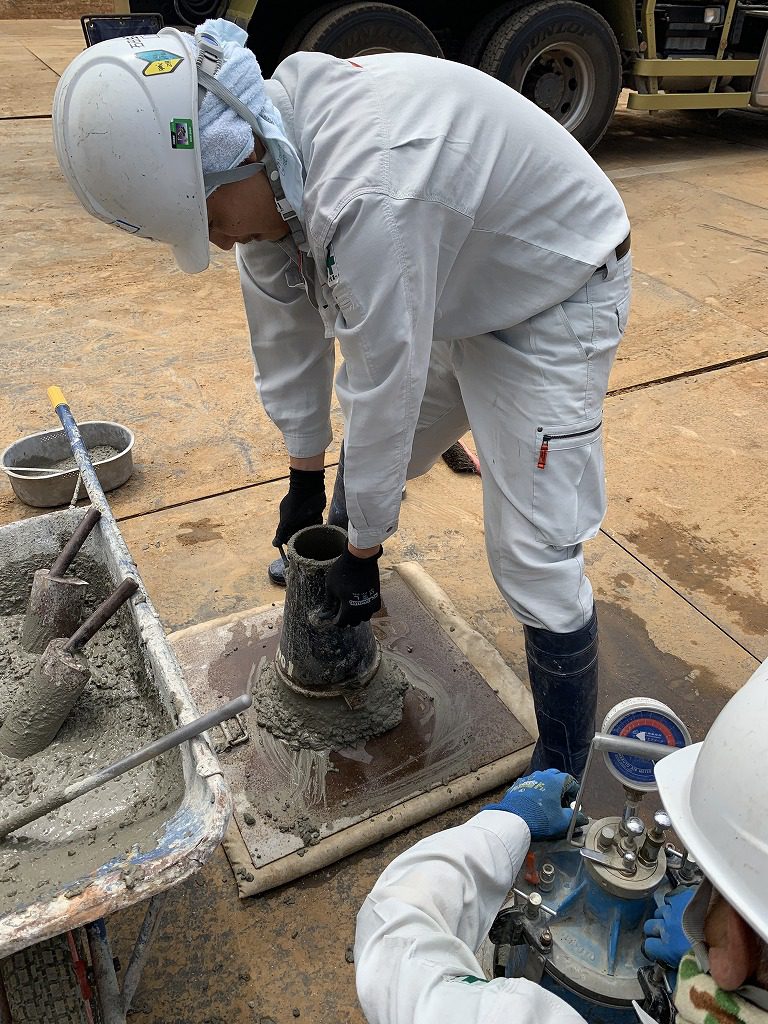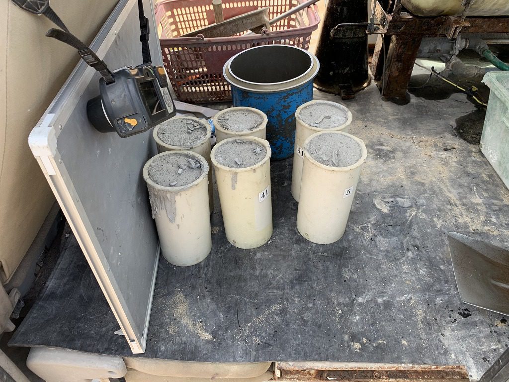 これは昨日採取した分で、現場環境に1日置いてから翌日試験室へ持ち帰り、圧縮強度試験の次工程へと進みます。こうして現場毎に毎日最初に現場試験を行います。
