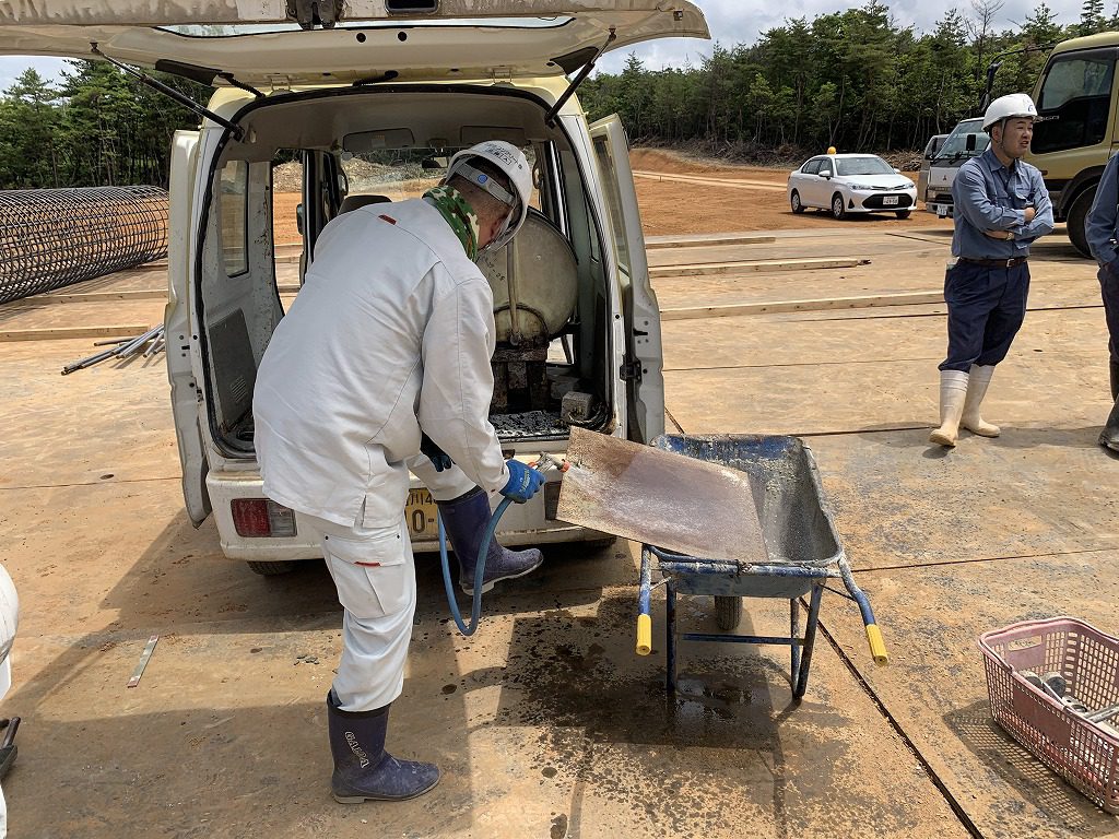 ミキサー車が現場に到着したら、まず最初に試験用に使う生コンクリートを採取します。スコップで生コンをよく練り混ぜます。