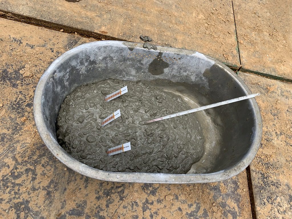 コンクリートに有害な塩分が多く入っていないか、カンタブで塩化物測定です。0.3kg/㎡以下で合格です。そして温度計でコンクリート温度測定です。生コンはナマモノなので、新鮮な食材と同じで適切な温度管理が大切です。暑いと乾いてひび割れ、寒いと生コン内の水分が凍結してしまいます。5℃~35℃の範囲で合格です。