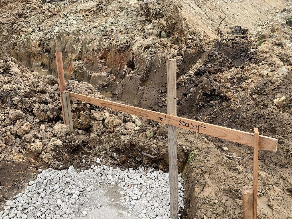 『この500上り△と書いてある板の上辺から500㎜下に側溝の天端がくるように側溝を設置する』