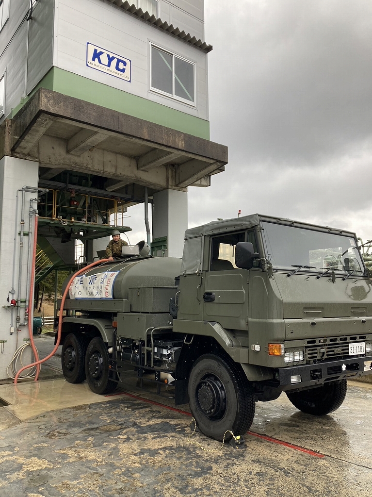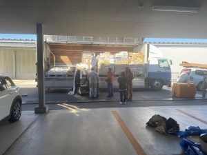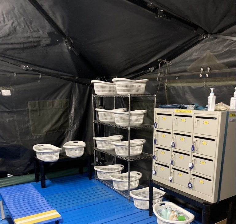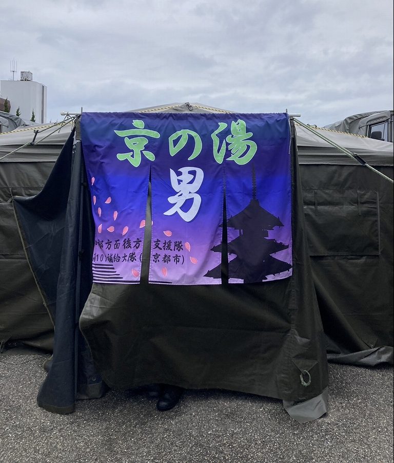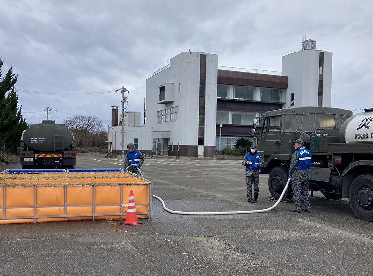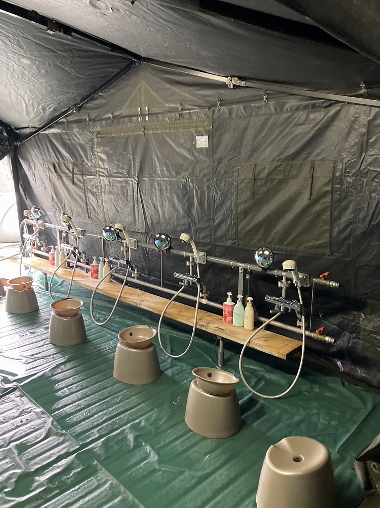 また、被災者救済と被災地の応急復旧のため県内県外各地より沢山の皆様にご尽力頂いていてますことに深く感謝申し上げます。その中のひとつとして、自衛隊による仮設浴場の無料開放です。この浴場はみんながホッとできるホットスポットとなっています。私たちは浴場に地下水の提供をさせていただいています。運んできた水をバスタブへ。
