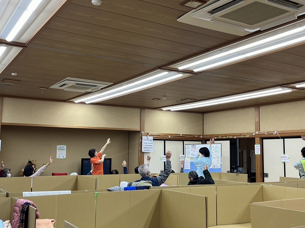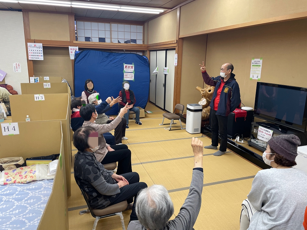 避難所では運動量が大幅に減って、筋力の低下やストレスにつながりやすいそうです。避難所の皆さんにいつでもできる体操を教えてくださいました。言葉をかけ合いながら笑いもあり、和気あいあいとした時間です。