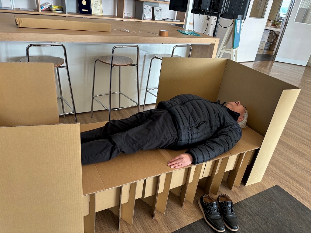 今、この避難所では段ボールベッドの仕切りに表札のように住所と名前を書いて貼ってあります。そして部屋の真ん中にはみんなが集うだんらんの場所も段ボールベッドで作ってありました。事務室には住宅地図のように位置図も貼ってありました。アイデアひとつで部屋が町のようになっていました。素晴らしいです。今ではこの上に布団を敷いてゆっくりと眠っています。