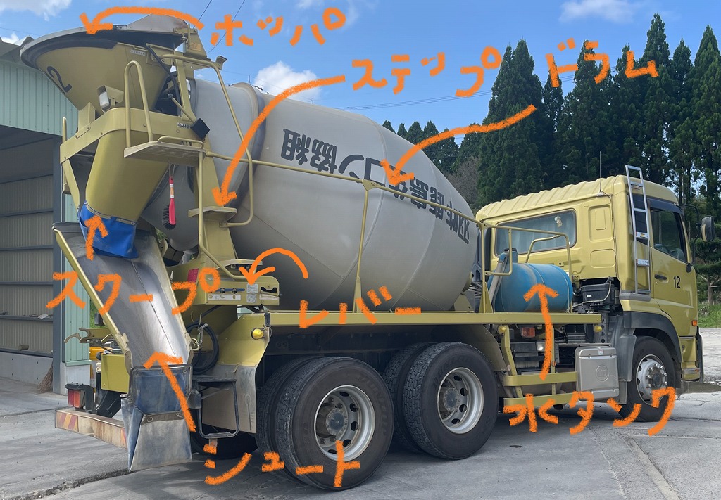 ミキサー車は、工場で作られた出来立てホヤホヤの生コンクリートを、品質を保ちながらお客様の現場まで、愛をこめて輸送する役割です。ちなみに、なまものである生コンクリートは工場で練り混ぜを開始してから、90分以内の荷卸しが必須です。生コンは、水とセメントと砂と砂利を混ぜて作ります。その材料はそれぞれ比重が違うので、時間の経過とともに分離して品質が劣化してしまいます。それを防ぐためにミキサー車のドラムの中で常に撹拌させながら現場へと運ぶのです。ミキサー車の後部上のホッパは、生コンの投入口で、ここを通してドラム内へと投入されます。