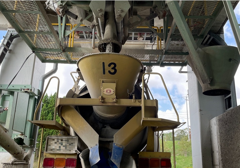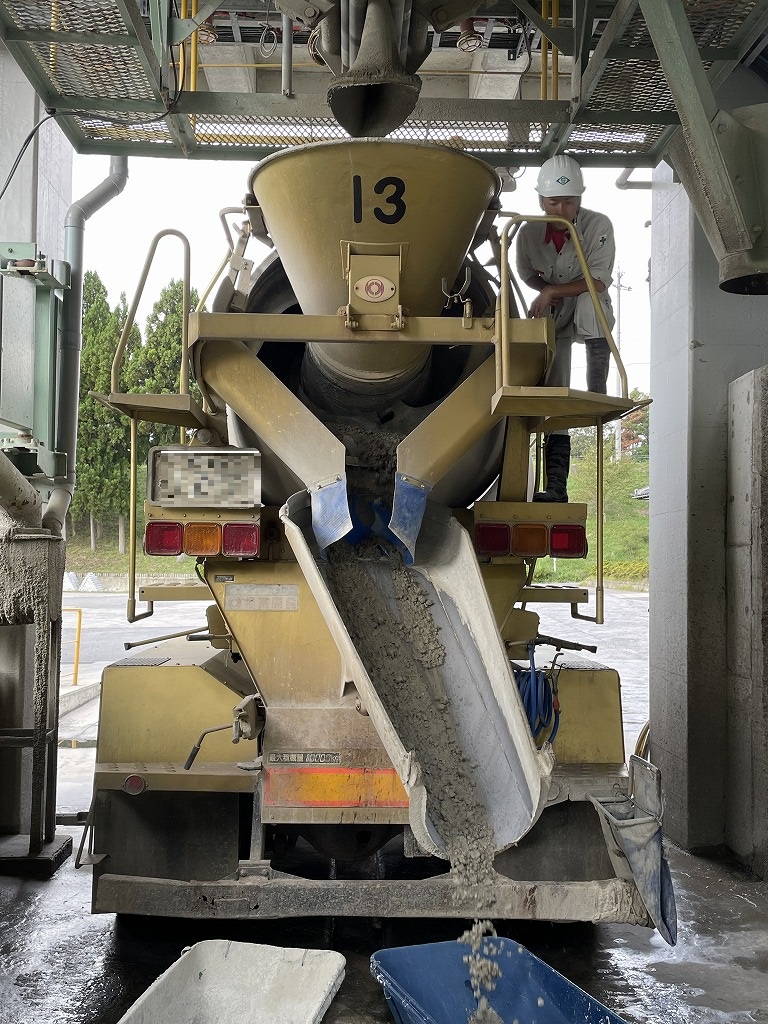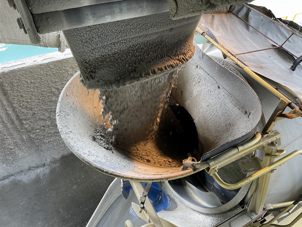 工場で出来上がった生コンが排出されて、ミキサー車のホッパへと投入されています。