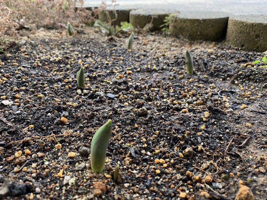 秋に植えたのが、ふと気付いたら芽吹いていました。さて何が咲くのでしょうか??