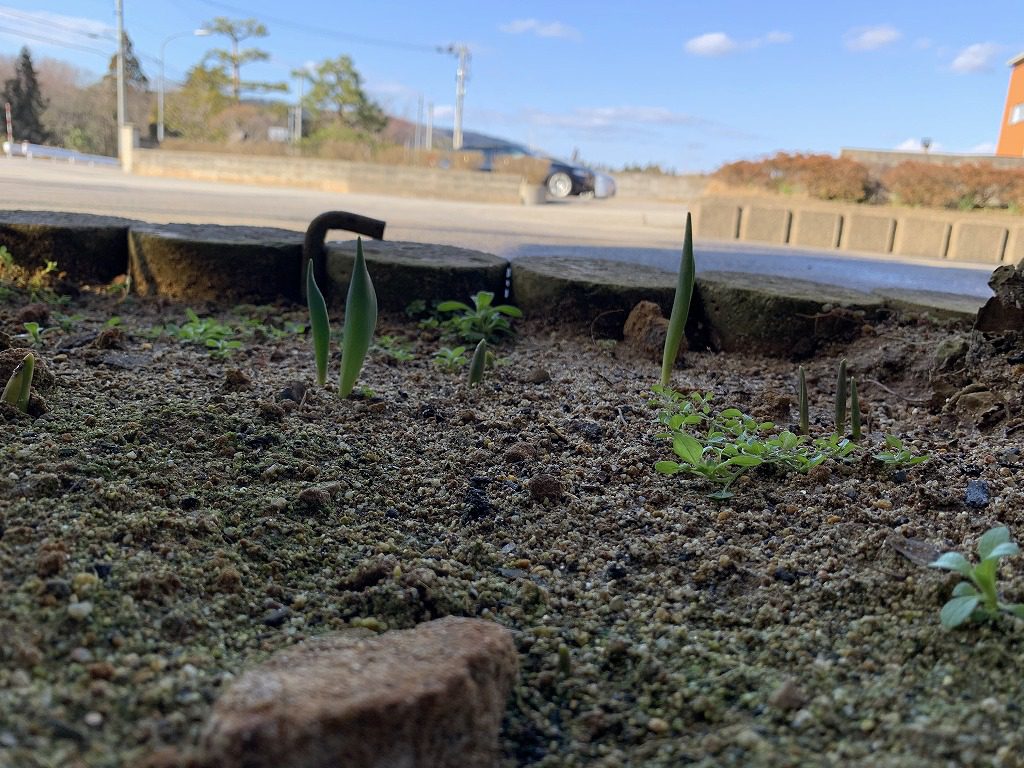 ずっと冬らしくなかったので、チューリップの芽が頼りなさそうに1か月も早くから出てきています。そしてここにも、間違えて出てきてしまった・・😢ホテル建設工事完成です!!