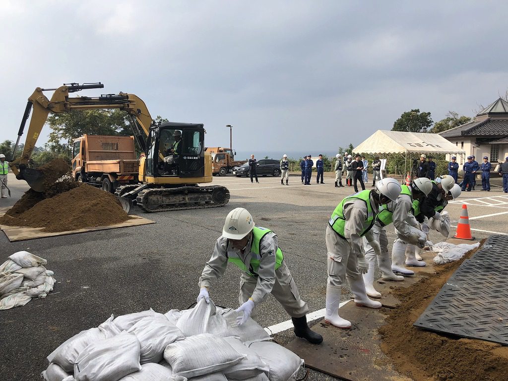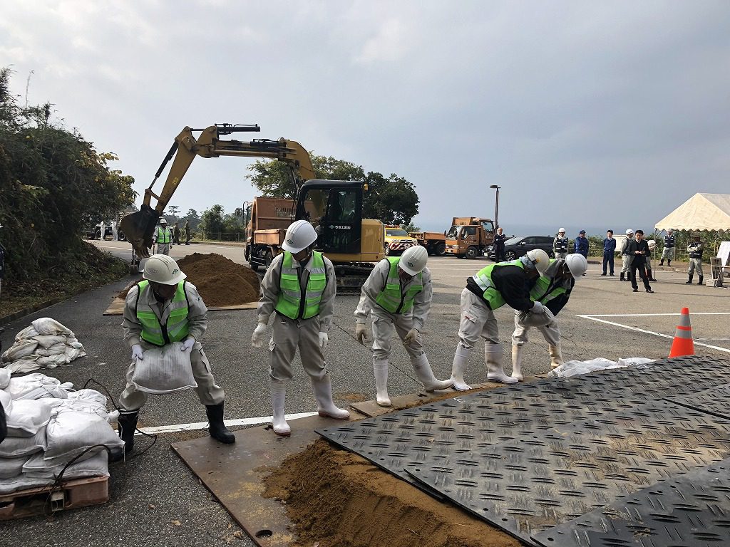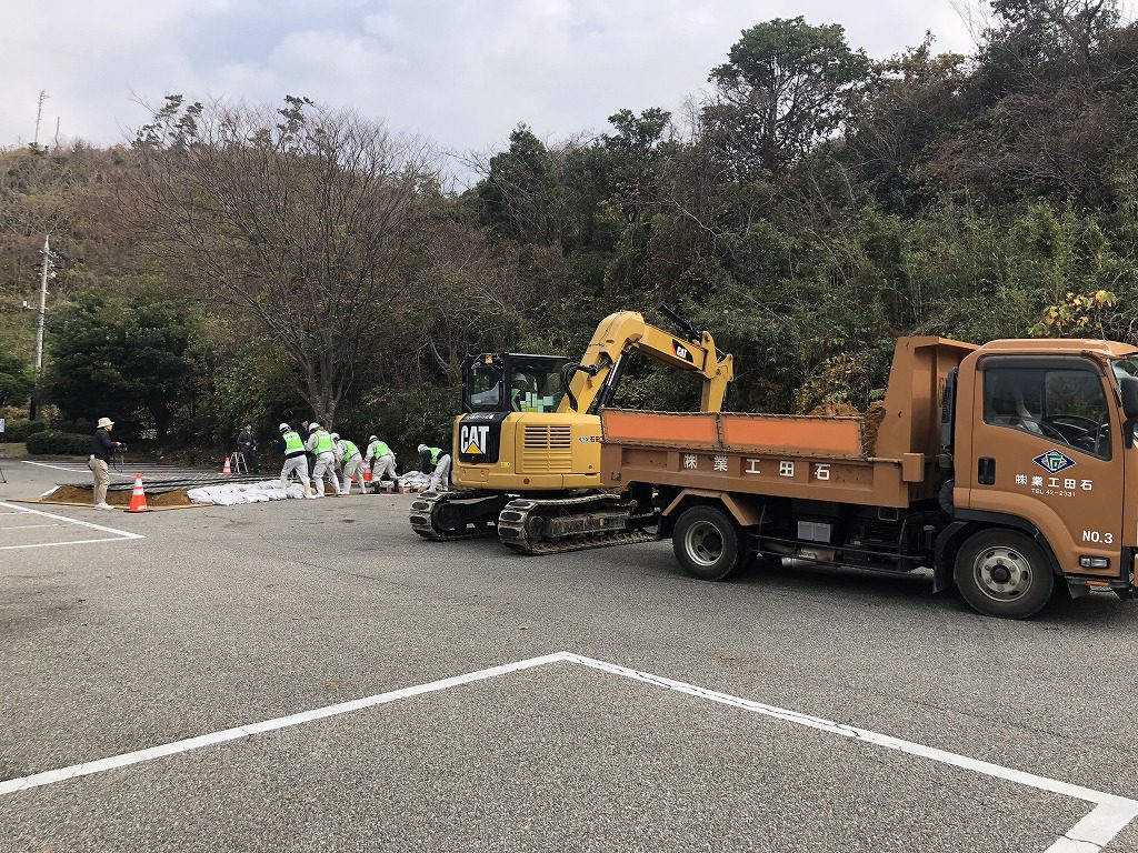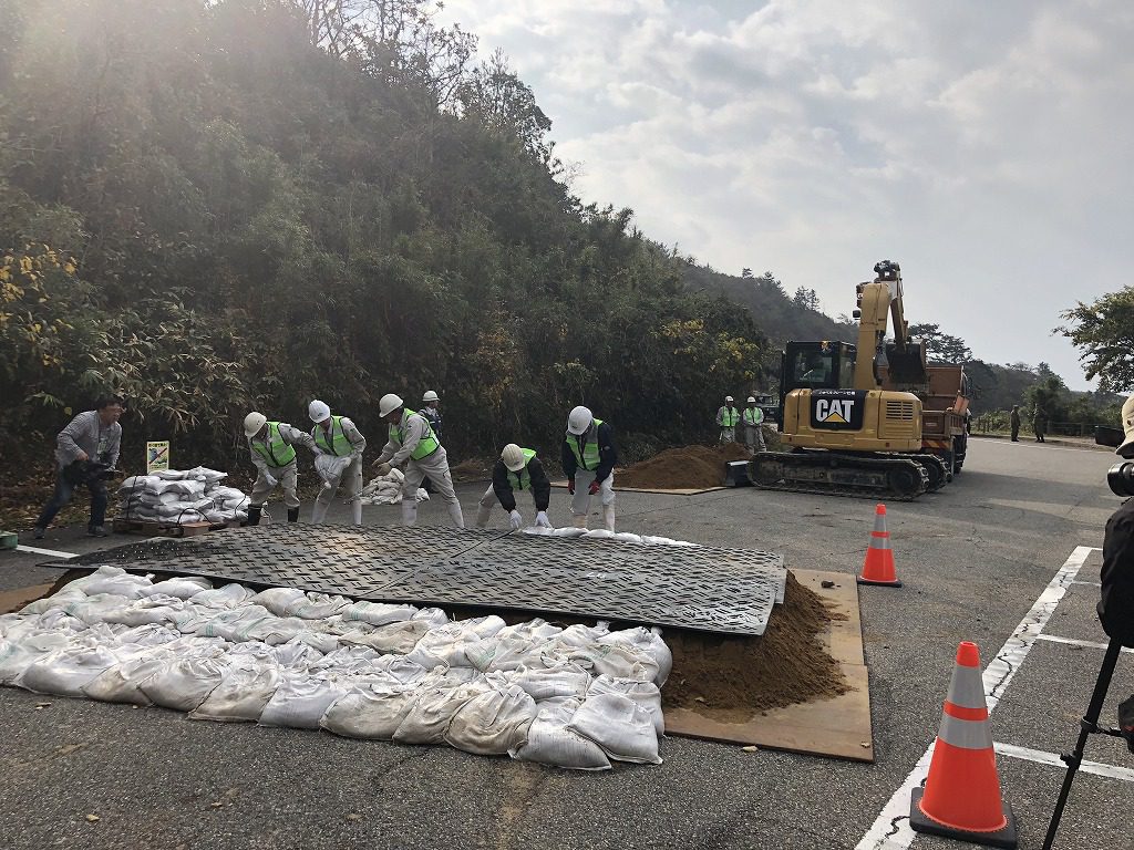 地震により「道路法面の土砂崩れ」および「道路陥没による段差」が生じ、県道が遮断され、住民避難のための車両が通行できない設定です。あらかじめ土砂崩れ(イメージ)と段差をつくり、その後、訓練として応急復旧工事です。