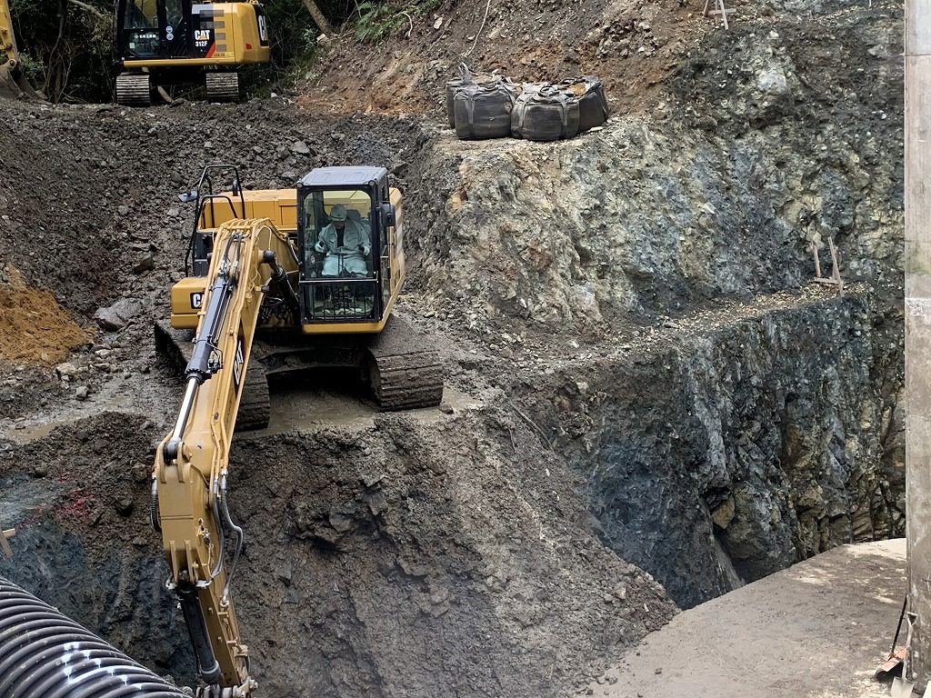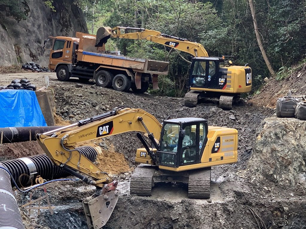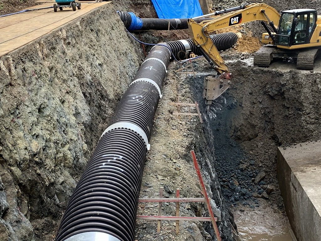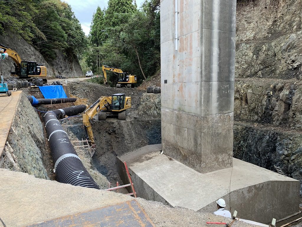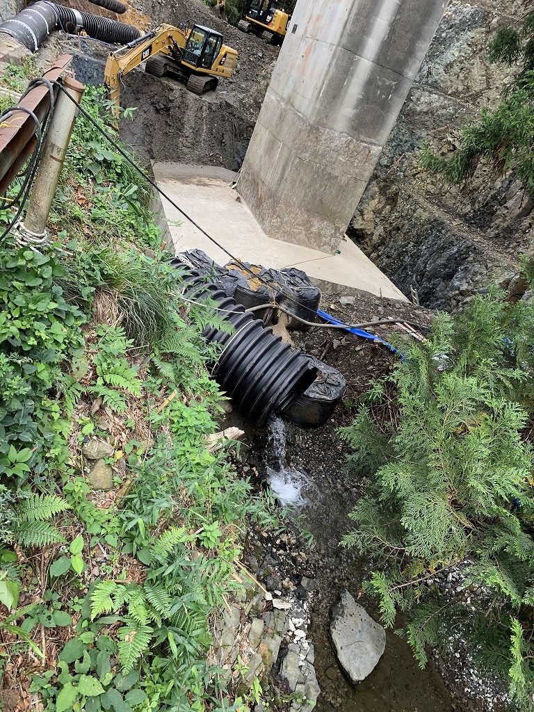 そして、ここには川が流れていたので工事中は、コルゲート管で川の水を流します。この黒い太いパイプの中に川が流れています。