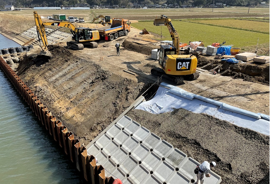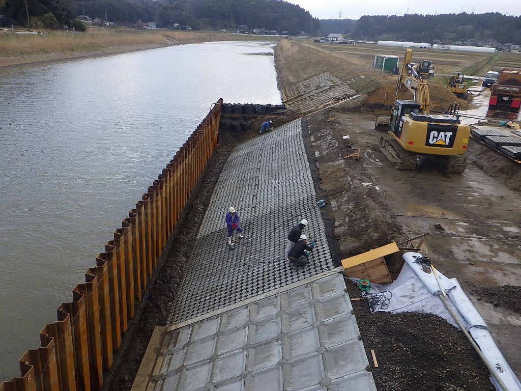地盤改良後、法面を平らに整形し、ブロックやブロックマットを設置していきます。