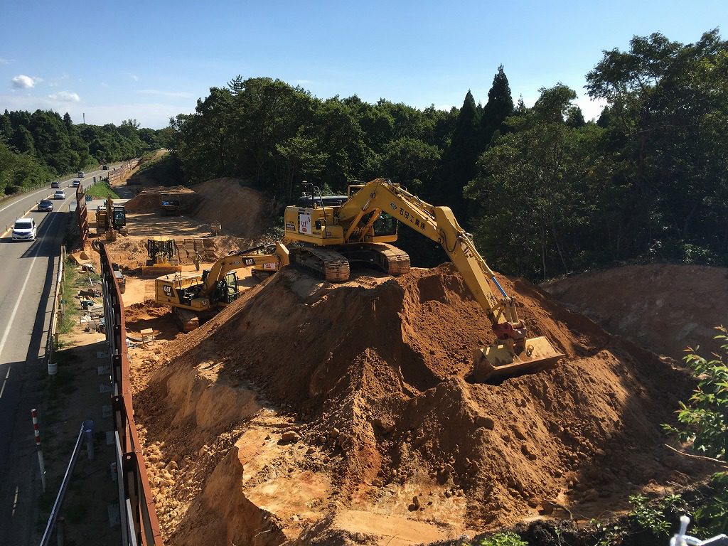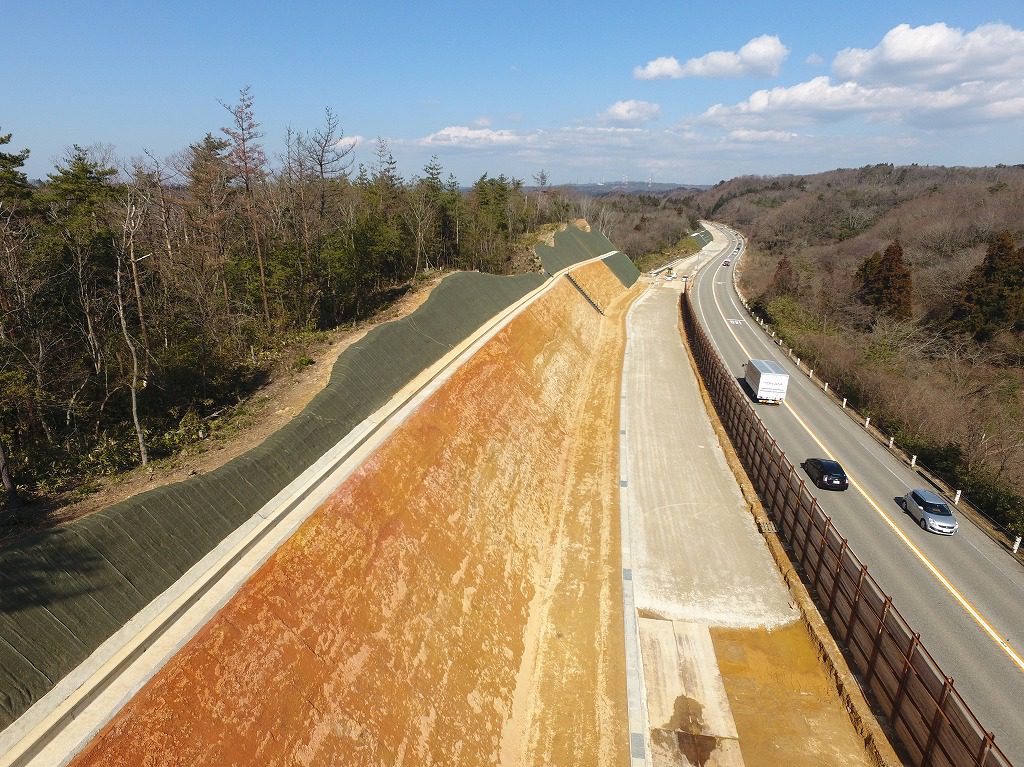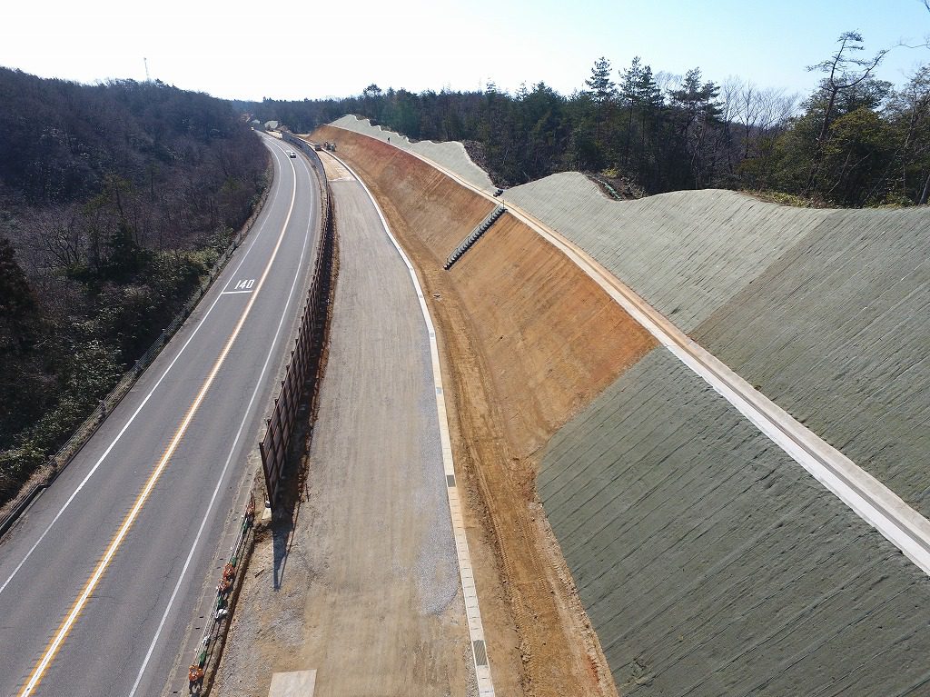 そして、他社さんへとバトンタッチし、法面の植生工と道路の舗装工へと続きます。
