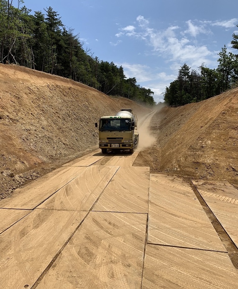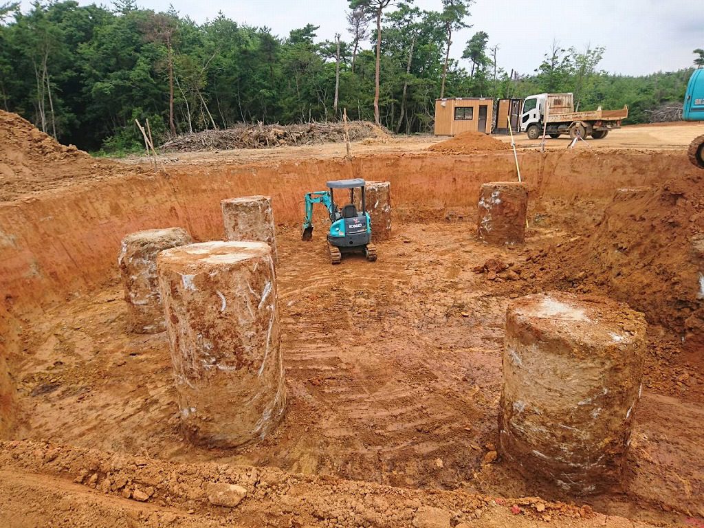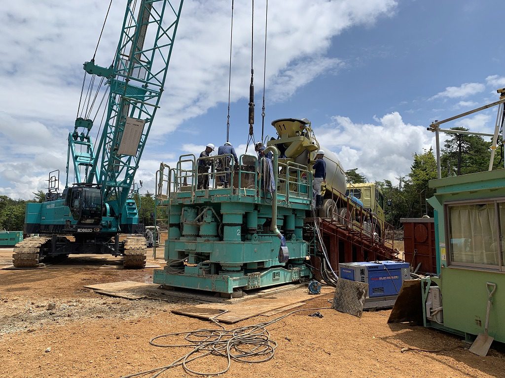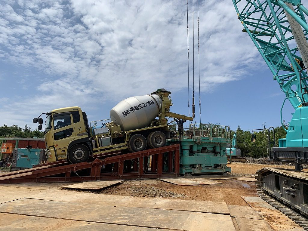 現場は場所打ち杭工です。建設する構造物に対して地盤が軟弱なので、それを改良するために杭を打ち地盤を締め固めるんですね。8本の杭が打たれます。生コン車架台に乗りこんでの打設です。