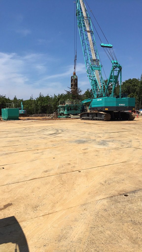 こちらでは、杭が打たれる場所にハンマーグラブで穴を掘っています。