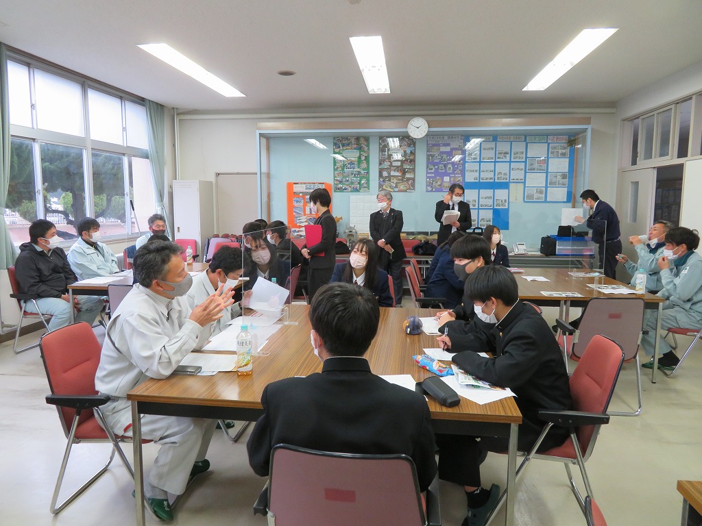羽咋工業高校OBの当社土木部奥本が「建設業は未来を創る仕事です」を演題にプレゼンテーションをさせていただき、その後5班に分かれて意見交換会をしました。