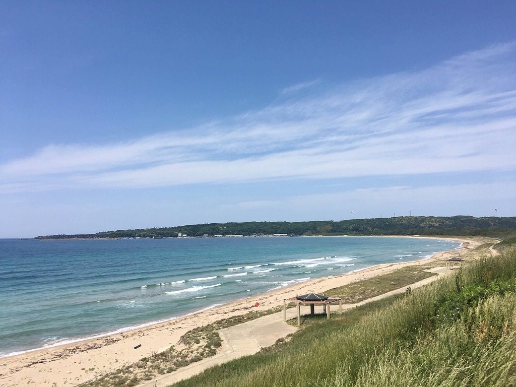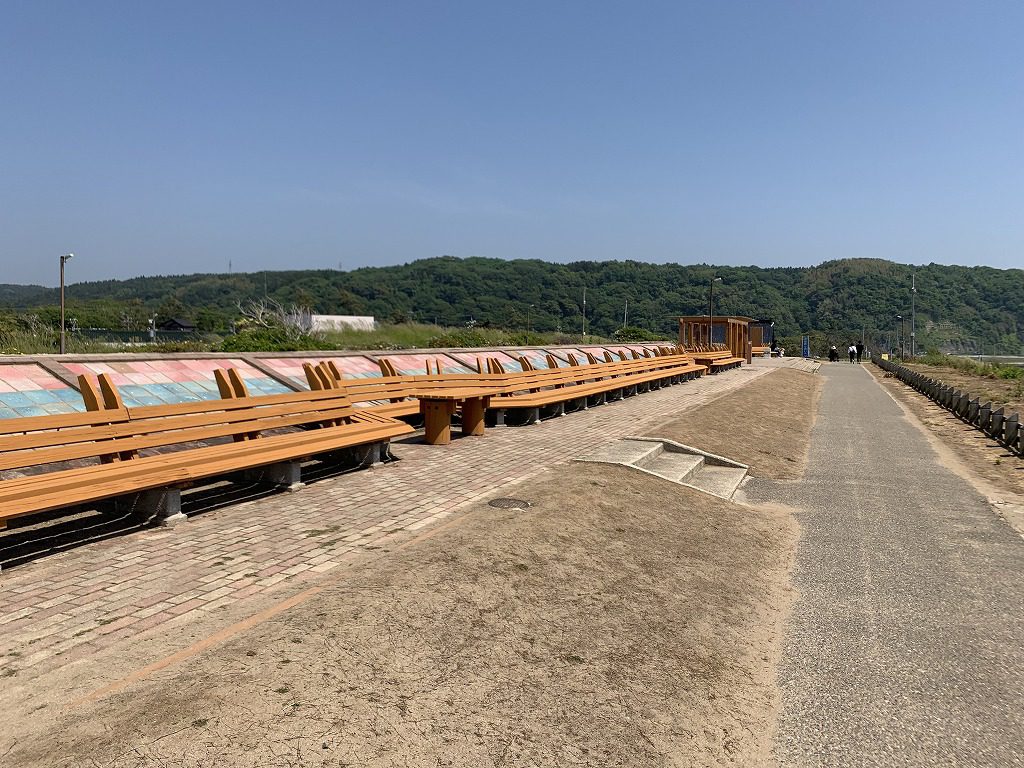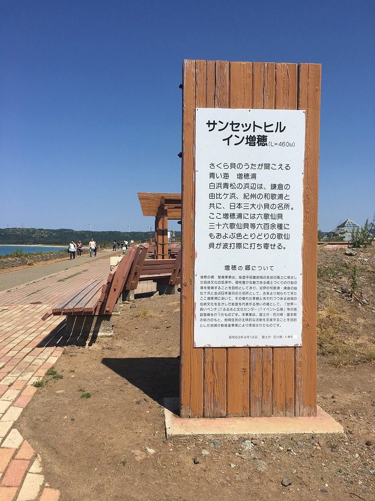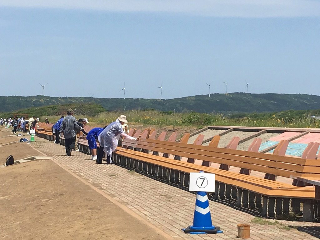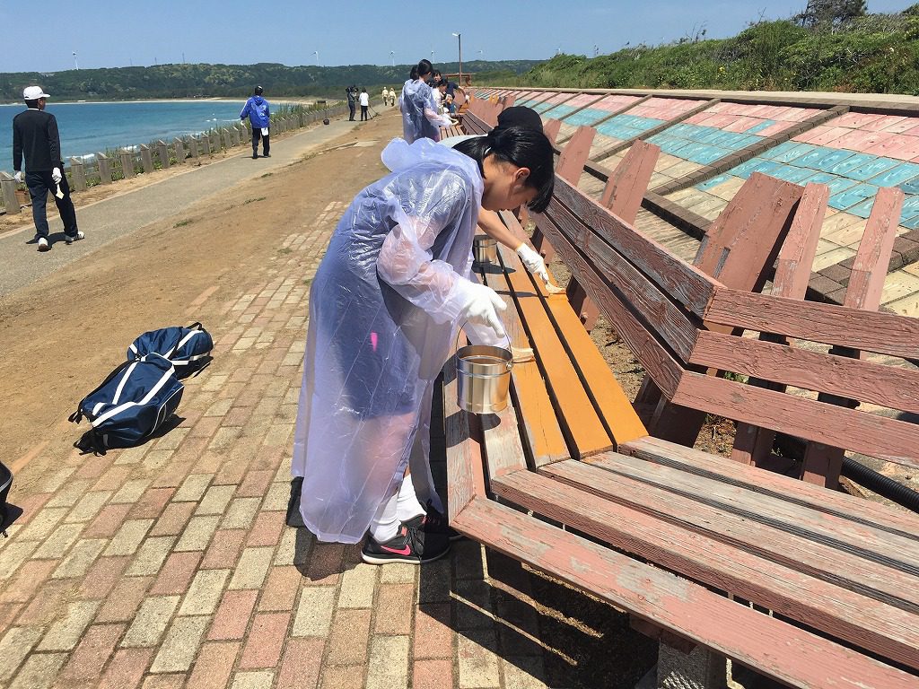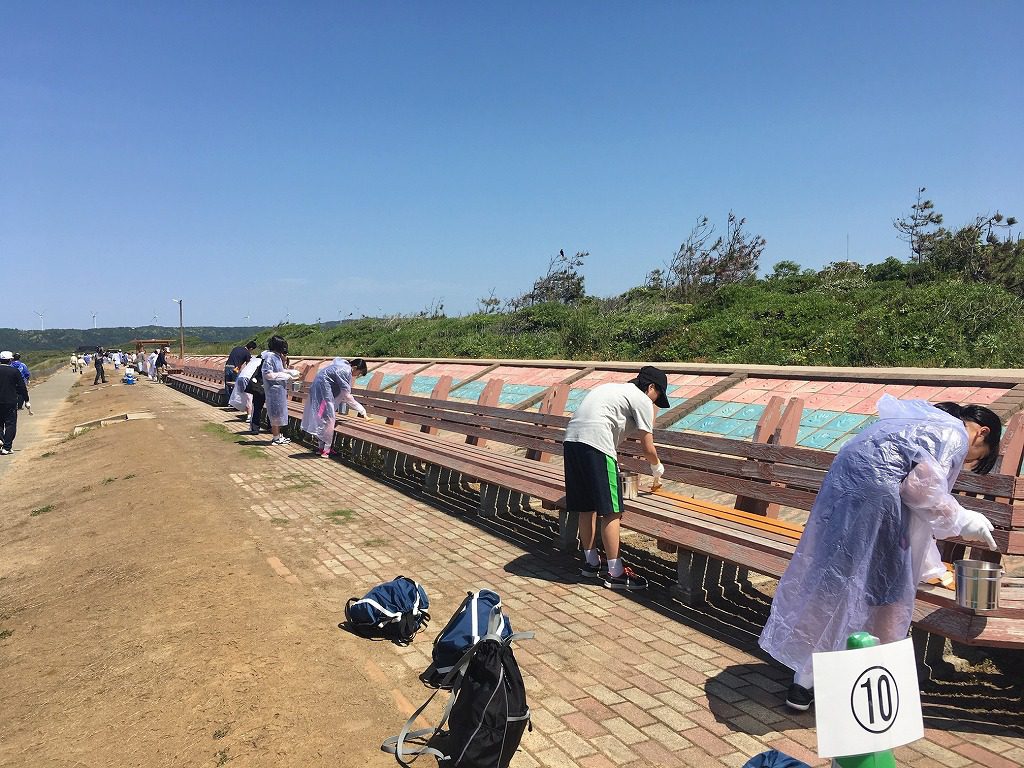 5月23日、地元中学生と町観光協会と富来商工会関係者で増穂浦海岸にある世界一長いベンチのペンキ塗り替え作業が行われました。5年前から毎年恒例の塗り替え作業です。当社からは社長が参加です。さあ、始まります!