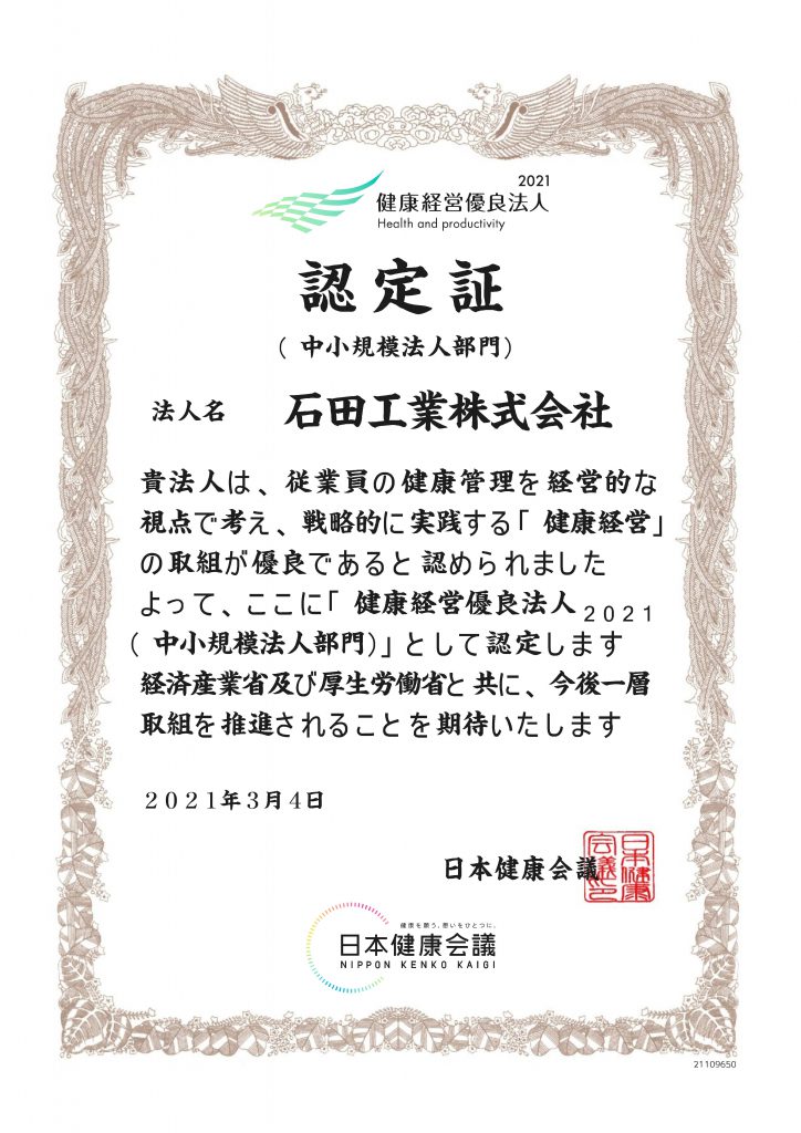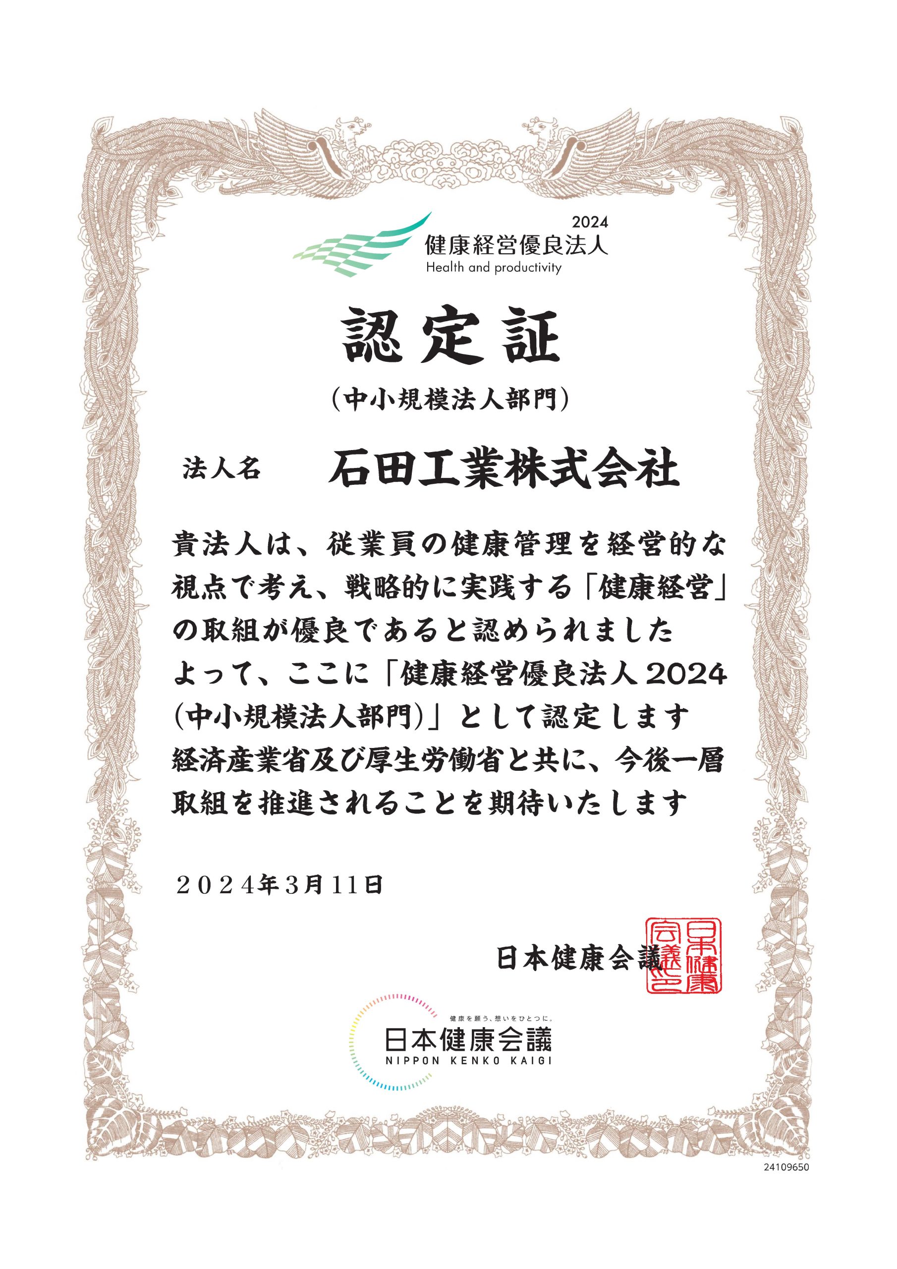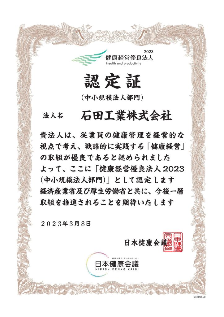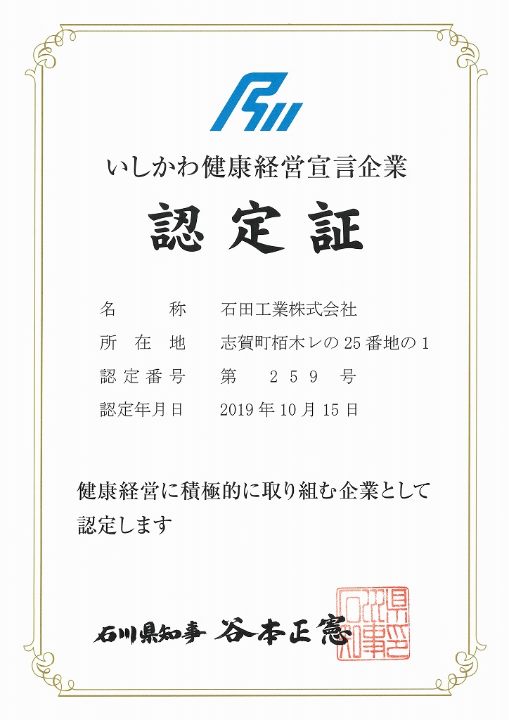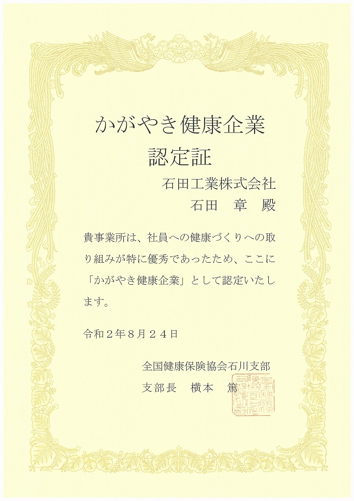 いしかわ健康経営宣言企業認定書