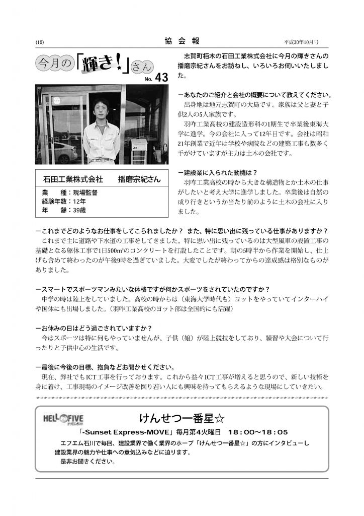 2018年10月17日 / 最終更新日時 : 2019年6月28日 ishida お知らせ 協会報に紹介されました石川県建設業協会の協会報10月号『今月の輝き!さん』に当社土木部の播磨宗紀さんが紹介されました。 そして、今月10月23日㈫18:00からエフエム石川の「Sunset Express-MOVE」にも出演します。是非お聞き下さい!!