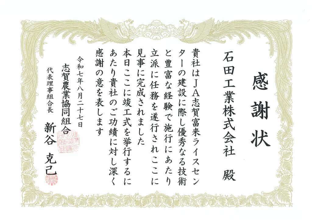 2025年10月17日 / 最終更新日時 : 2025年10月17日 ishida お知らせ 志賀農業協同組合様より感謝状を受賞しました。志賀農業協同組合 代表理事組合長 新谷克己様より、JA志賀富来ライスセンター建設工事において感謝状を受賞しました。 ご理解とご協力を頂きました地域の皆様には心より感謝申し上げます。