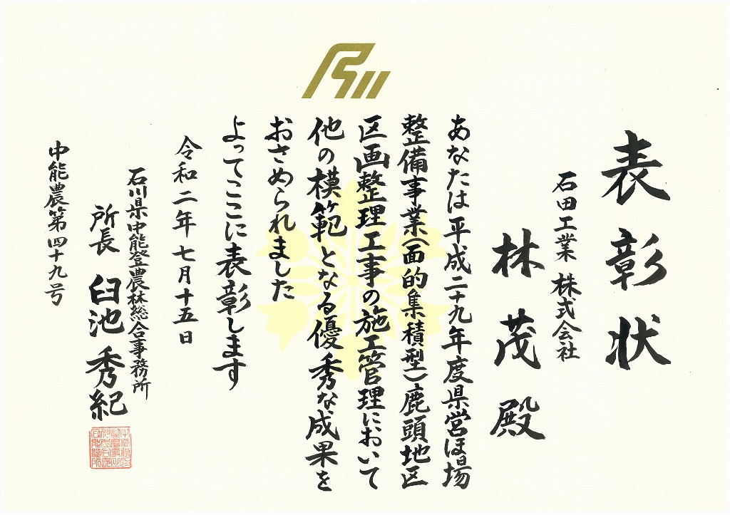 当社土木部部長 林茂さんが、中能登農林総合事務所所長より代理人表彰を受賞しました。