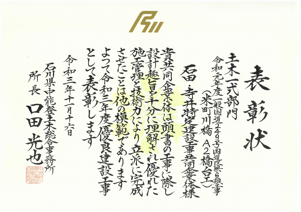 2021年11月18日 / 最終更新日時 : 2022年11月15日 ishida お知らせ 石川県中能登土木総合事務所長表彰を受賞しました令和元年度 一般国道249号国道改築6種工事(米町川橋 A2橋台工)において、石川県中能登土木総合事務所長表彰を受賞しました。 ご理解とご協力を頂きました地域の皆様には、心より感謝申し上げます。