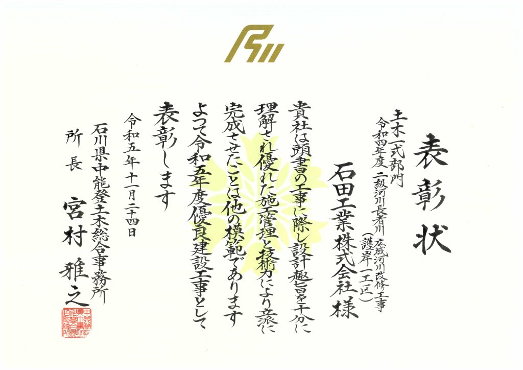 2023年12月16日 / 最終更新日時 : 2023年12月16日 ishida お知らせ 石川県中能登土木総合事務所長表彰を受賞しました令和4年度 二級河川長者川 広域河川改修工事(護岸1工区)において、石川県中能登土木総合事務所長表彰を受賞しました。 ご理解とご協力を頂きました地域の皆様には、心より感謝申し上げます。