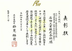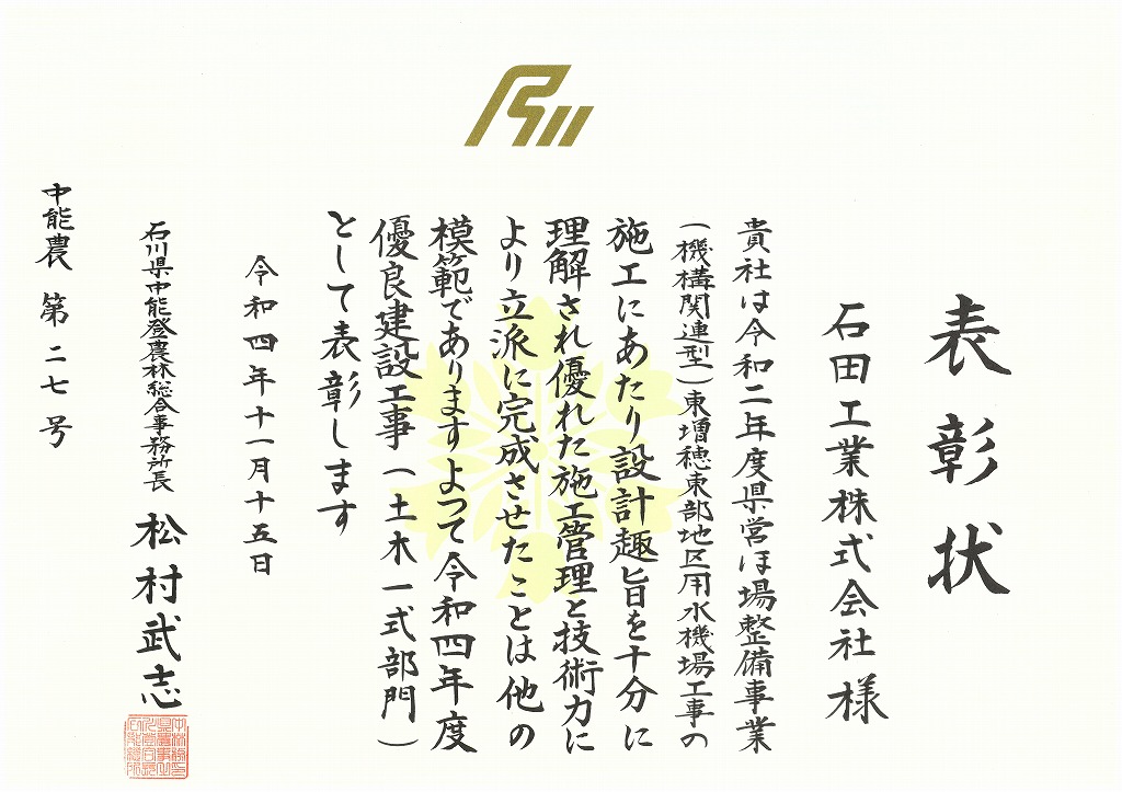 2022年11月15日 / 最終更新日時 : 2022年11月15日 ishida お知らせ 石川県中能登農林総合事務所長表彰を受賞しました令和2年度 県営ほ場整備事業(機構関連型)東増穂東部地区用水機場工事において、石川県中能登農林総合事務所長表彰を受賞しました。 ご理解とご協力を頂きました地域の皆様には、心より感謝申し上げます。