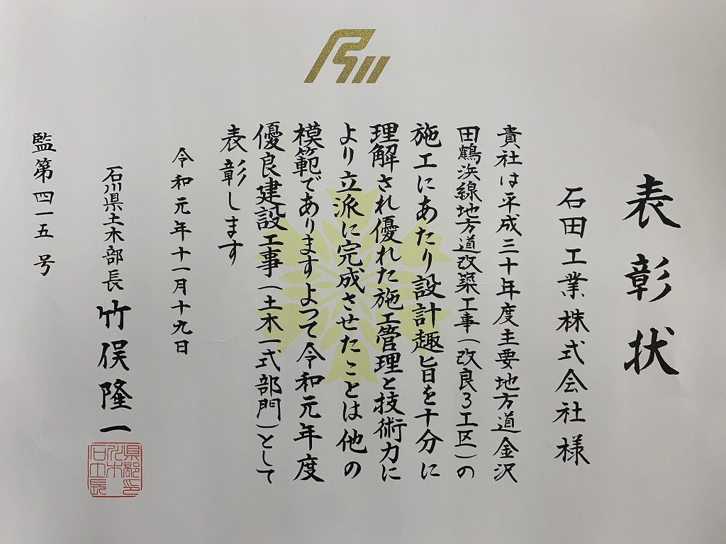 2019年11月20日 / 最終更新日時 : 2020年11月17日 ishida お知らせ 石川県土木部長表彰を受賞しました平成30年度 主要地方道 金沢田鶴浜線地方道改築工事において、石川県土木部長表彰を受賞しました。 ご理解とご協力を頂きました地域の皆様には、心より感謝申し上げます。