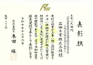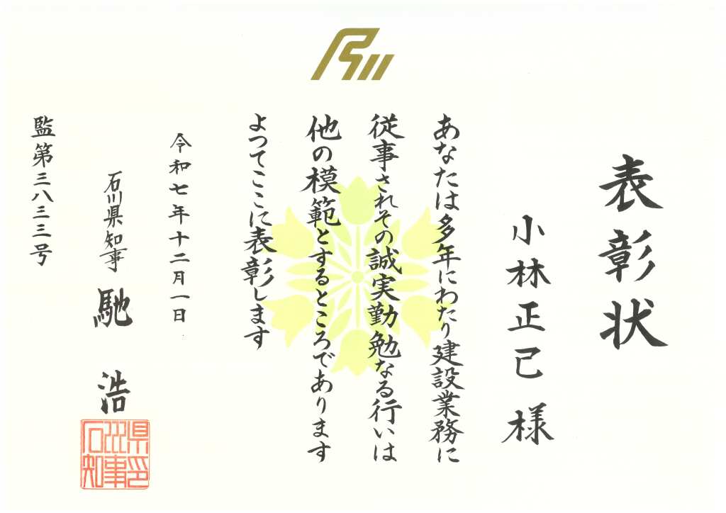 2025年12月26日 / 最終更新日時 : 2025年12月26日 ishida お知らせ 石川県知事より表彰状を受賞しました。当社土木部長 小林正己さんが、石川県知事より優良建設従業員表彰を受賞しました。