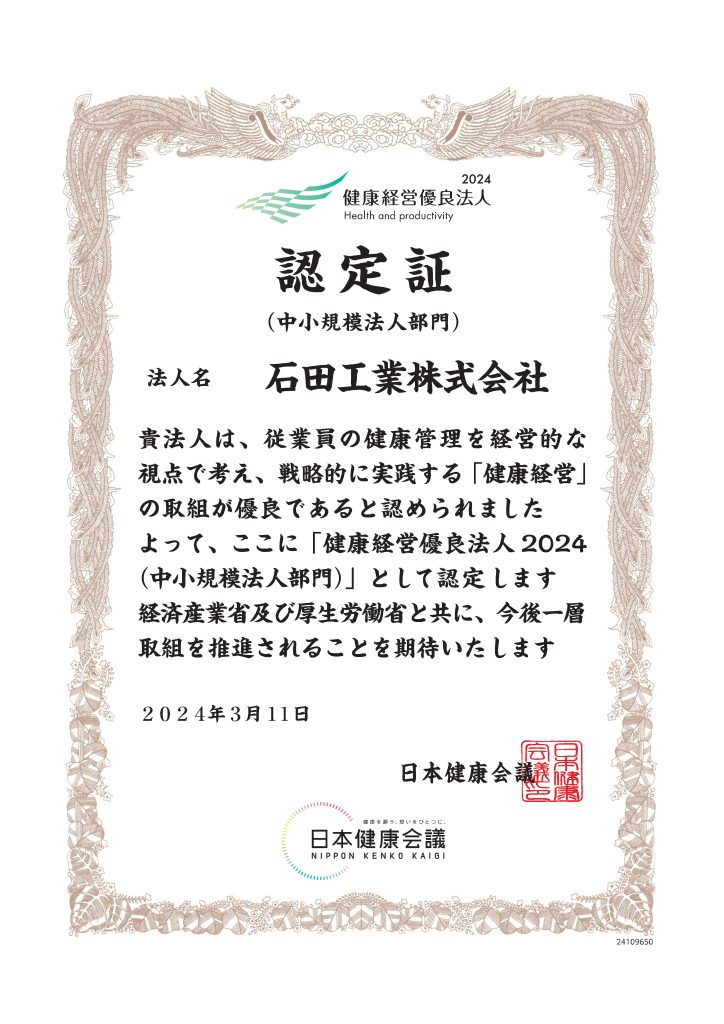 2024年3月12日 / 最終更新日時 : 2024年3月12日 ishida お知らせ 経済産業省 健康経営優良法人2024に認定されました経済産業省より「健康経営優良法人2024(中小規模法人部門)に認定されました。今後も引き続き、健康経営の取り組みを推進して参ります。